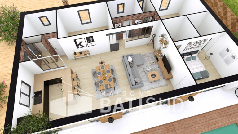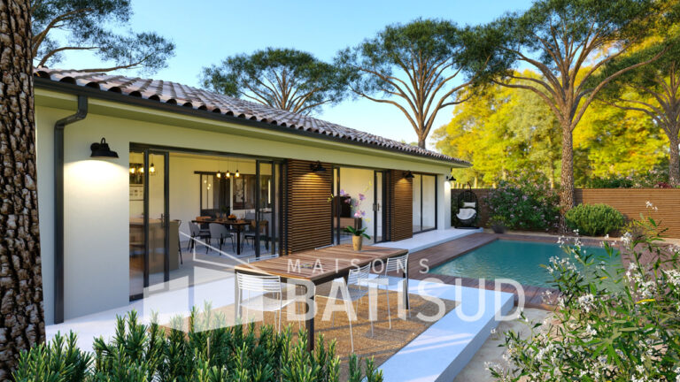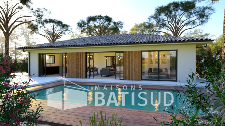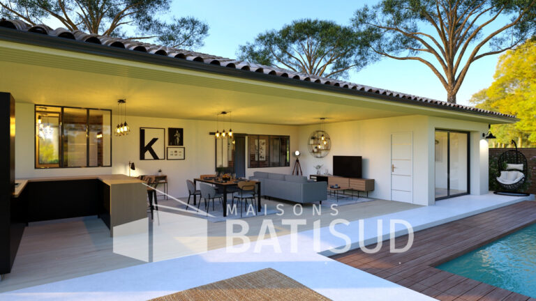 Laissez-moi vous présenter notre modèle de maison de 90 mètres carrés, entièrement pensé par **Maisons BATI SUD**. Dès l’entrée, vous serez accueilli(e) dans un espace chaleureux et lumineux, avec un vestiaire pratique. La grande pièce de vie modulable s’ouvre sur une cuisine conviviale, qui donne elle-même sur une terrasse. Imaginez les moments agréables que vous passerez ici, entre amis ou en famille !