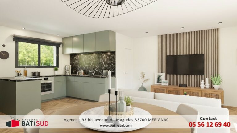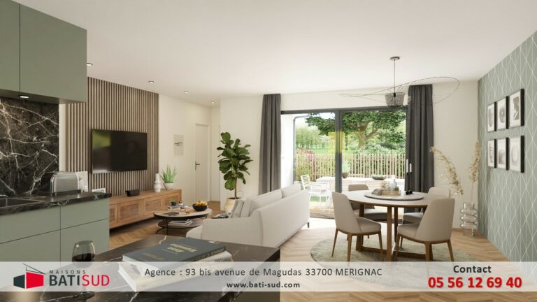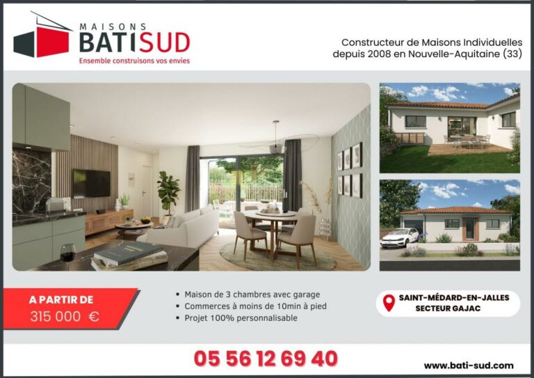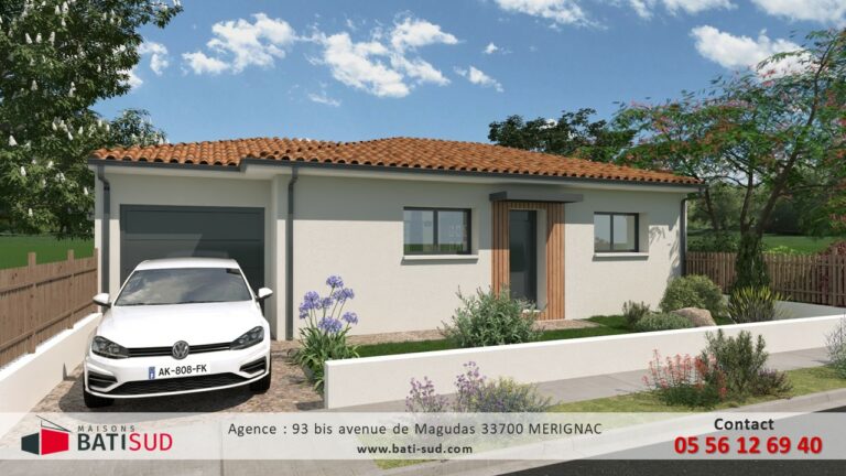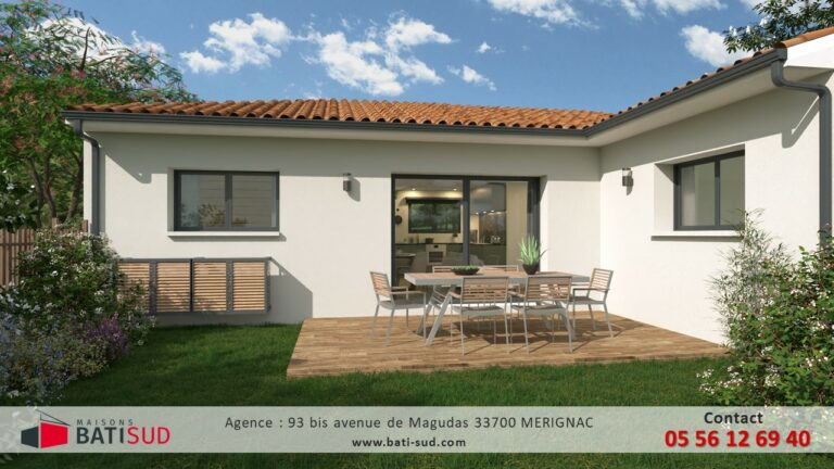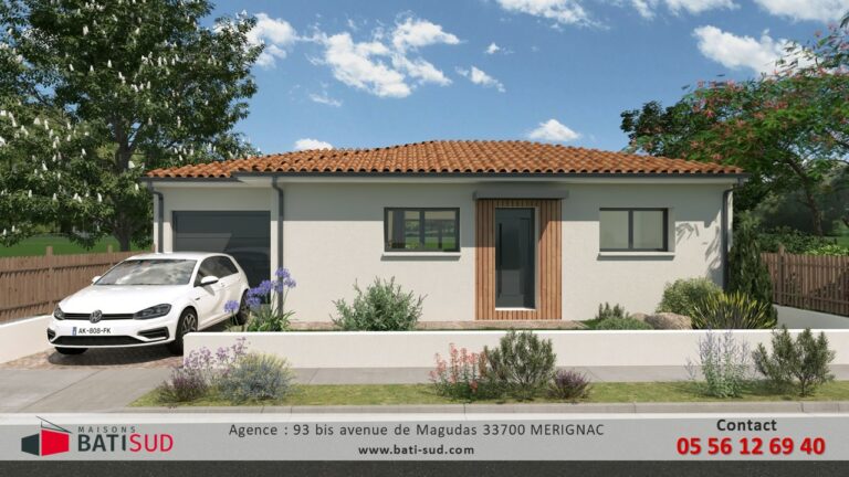Agence de MERIGNAC 05 56 12 69 40 Proposition de prix pour une construction avec MAISONS BATI SUD sur le terrain d’un de nos partenaires fonciers et sous réserve de sa disponibilité. Maison prête à décorer, hors frais de terrassement, de viabilisation, financier et de notaire. Maison 100% personnalisable suivant vos besoins et vos envies. Photo non contractuelle.
